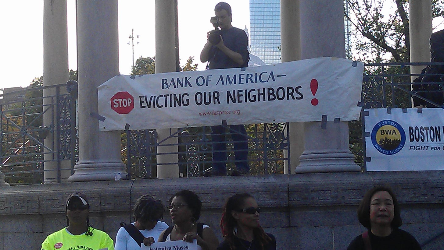 It is disingenuous to say that the marchers and demonstrators lack organization, an agenda, or a leader. On the contrary, the grievances expressed at “Occupy Boston” seem to be clearly expressed, well founded, and widely shared. The gross gap between the earnings and power of the corporations holding most of the loans on our homes and we the people crassly corrodes our ability to participate in the system and negotiate as human beings with rights and dignity.