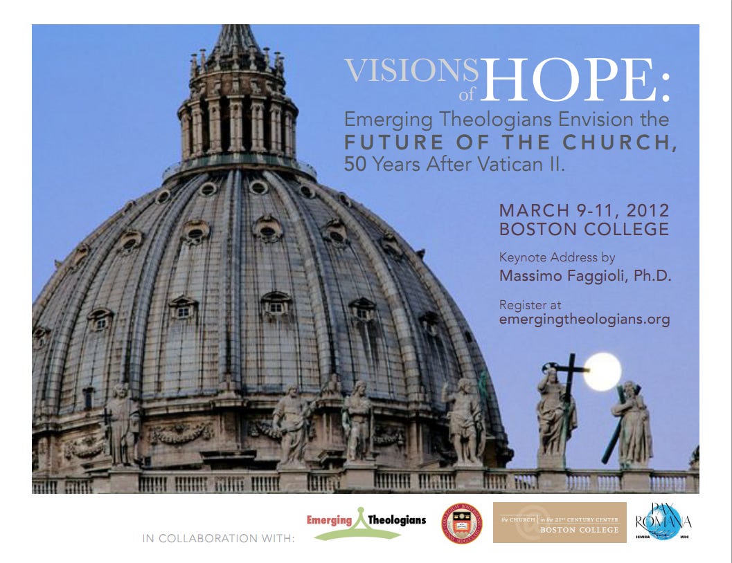The Theology Graduate Student Association of Boston College, in partnership with the Church in the 21st Century Center and ICMICA/Pax Romana, will be hosting a conference entitled, "Visions of Hope: Emerging Theologians and Young Church Leaders Envision the Future of the Church," to take place March 9-11, 2012 at the Boston College School of Theology and Ministry. The purpose of the conference is to commemorate the 50th anniversary of the Second Vatican Council by providing a forum for theologians and church leaders to critically discuss the reception of the council in light of present-day and future challenges. The opening reception, which is open to the public, will feature a keynote address by Massimo Faggioli (University of St. Thomas) and a response by Maria Teresa Davila (Andover Newton Theological School). Of particular interest to Catholic moral theologians will be a concurrent session on the topic of the future of Catholic ethics. Full details, including a schedule of paper presentations and a link for registration, can be found at the conference website, www.emergingtheologians.org. For further information from the conference organizers, please contact emergingtheologians@gmail.com.