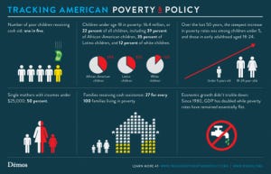 Now, let’s parse out a bit this long segment from John Paul II’s encyclical. John Paul II acknowledges and throughout other sections of CA explains the positive role of government. The encyclical also places national government in relationship to local and intermediary levels of government. However, John Paul II is also trying to point to necessary limits to the strength and power of government in relation to the full dignity of the human person and the common good. Let me be as clear as possible – the primary concern for John Paul II is the dignity of the human person and the fullness of the common good. The fullness of the common good involves the full flourishing of civil society, which is broader than the more limited public order (which according to Vatican II and John Courtney Murray is the function of government...but this will be the subject of future post). This concern is different from the primary concern among many GOP discussions – which is either purely economic or a mix of economic with individual liberty sprinkled on top. The measure of the social assistance state for Catholic social teaching is not merely a matter of labor participation (the question of at what level taxation and social assistance becomes a genuine disincentive to work) but about the flourishing of civil society. John Paul II is concerned with government intervention paralleling communism where the government takes over the functions of all other levels of society and eroding any personal sense of responsibility for our neighbor. Now let’s look at the United States of America – are we the social assistance state? On the economic front, there is no empirical evidence that we have either a taxation level or social assistance which provides a genuine disincentive to work. While many raise questions concerning the strict regulations for assistance (cash welfare, Medicaid, etc) the debate about disincentives are not about creating a disincentive to desire working –but that the jobs one can receive cannot support oneself and one’s children. It is not reasonable to consider something a disincentive to work when the labor options available do not or cannot achieve a basic standard of living. In such situations, the problem is not that social welfare programs are TOO generous so as to make work unappealing but that part time and minimum wage jobs do not raise someone above the poverty level and our structures do not allow people to maintain needed benefits while working. (In large part because our poverty level is set far below what is required for basic standard of living as necessary for within Catholic social teaching). Moreover, the recipients of most social assistance are the working poor and children. Take a look at the following chart from the DEMOS foundation:
